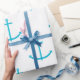 Are you looking for nautical theme wrapping paper? This wrapping paper has a pattern of turquoise anchors.