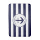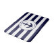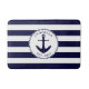 Nautical bath mat is a beach themed bathroom decor that is decorated with a navy blue ship anchor, family name, year of est., navy and white stripes, and a rope circle. It's easy to personalise this bath mat with your name, initials, family name or another text.