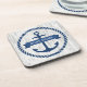 Coasters featuring a dark blue nautical anchor surrounded by a rope border on a light grey driftwood background. Across the anchor is a blue ribbon with a template field for your boat's name or other custom text.