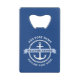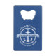 Bottle opener featuring a white nautical anchor surrounded by a rope border on a dark blue background. Across the anchor is a light blue banner with customisable text "welcome aboard". Add your boat's name and hailing port.