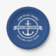 Paper plate featuring a white nautical anchor surrounded by a rope border on a dark blue background. Across the anchor is a light blue banner with customisable text "welcome aboard". Add your boat's name and hailing port.