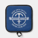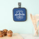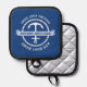 Pot holder featuring a white nautical anchor surrounded by a rope border on a dark blue background. Across the anchor is a light blue banner with customisable text "welcome aboard". Add your boat's name and hailing port.