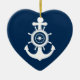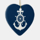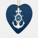 Customisable heart shaped ornament with nautical theme illustration featuring a white anchor, steering wheel and compass logo on navy blue.