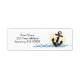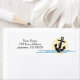 This return address label features a graphic of an anchor with a rope, a yellow and white striped sun and several lines of blue water waves. Customisable text allows you to add your own name and address.