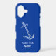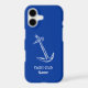 Personalized nautical blue wooden iPhone case featuring an engraved image of an anchor with the yacht club name which can be customized with your own name or the name of a person who loves boating, builds boats or loves sailing.