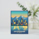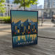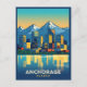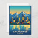A stylised illustration of the Anchorage, Alaska skyline at sunset, featuring mountains, water, and city buildings.