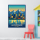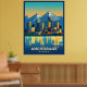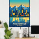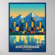 A stylised illustration of the Anchorage, Alaska skyline at sunset, featuring mountains, water, and city buildings.