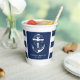 Striped nautical blue and white wedding paper cups. Great for a Navy (military) or lake house wedding. Design features an anchor wrapped in a banner with text "Anchored in love". Personalise it with your wedding details.