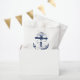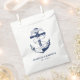 Nautical blue and white wedding favour bags. Great for a Navy (military) or lake house wedding. Design features an anchor wrapped in a banner with text "Anchored in love". Personalise it with your wedding details.