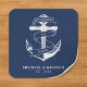 Nautical blue and white wedding square stickers. Great for a Navy (military) or lake house wedding. Design features an anchor wrapped in a banner with text "Anchored in love". Personalise it with your wedding details.