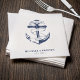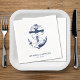 Nautical blue and white wedding napkins. Great for a Navy (military) or lake house wedding. Design features an anchor wrapped in a banner with text "Anchored in love". Personalise it with your wedding details.