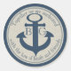 Blue anchor nautical style in navy blue over the rustic look of light burlap. Ocean or beach theme wedding sticker, "Anchored with Love".
