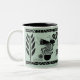 Ink drawings of plants and ancient geometric bees on lite green mug. Inspired by Ancient pottery style. Rock art.