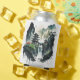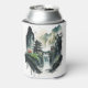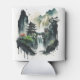 A beautiful can cooler showing an ink illustration of a landscape with ancient Chinese architecture and majestic waterfalls.
