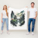 A beautiful fleece blanket showing an ink illustration of a landscape with ancient Chinese architecture and majestic waterfalls.