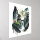 A beautiful foil print showing an ink illustration of a landscape with ancient Chinese architecture and majestic waterfalls.