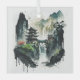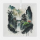 A beautiful square ornament showing an ink illustration of a landscape with ancient Chinese architecture and majestic waterfalls.