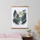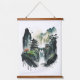 A beautiful wall hanging tapestry showing an ink illustration of a landscape with ancient Chinese architecture and majestic waterfalls.