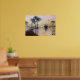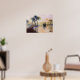 A boat, palm trees, golden fog and some buildings in the distance. A print from my oil pastel and acrylic painting.