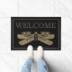 This custom Ancient Egyptian art hieroglyphic door mat or outdoor rug features an image of a winged scarab across the centre of the mat. The wings of the scarab span most of the width. The sparkly effect in the gold colour give it a glitter like appearance. The simple phrase "Welcome" is printed above the picture in a warm brown colour. A matching brown frame borders the rug.