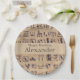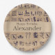 This custom party plate features an ancient Egyptian art theme. A series of Egyptian hieroglyphics are printed across a parchment paper style background.