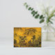 This fine art artist trading card features an impression of an ancient oriental landscape. Two small figures are walking through trees towards a pagoda in the foreground. Mountains loom in the distance. The autumn colours are gold, yellow, orange, green, brown and black.