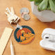 Carry the Ancient Pyramids Sacred mystique with you everywhere with this stunning Keychain Art. This captivating accessory features a bold, retro-style illustration of the pyramids at sunset, rendered in a rich colour palette of navy blue, burnt orange, and gold.