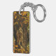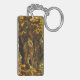 This fine art photography keychain displays an ancient brown and black maple tree trunk surrounded by brilliant autumn foliage in yellow, red, orange and green. The old knots and bark form an interesting abstract pattern.