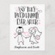 Congratulate someone on their wedding or wedding anniversary with this unique hand-lettering style card featuring the message, "And they lived happily ever after. Design includes fun chalk style illustration of bride and groom with bouquet, flowers and hearts on white background. Placeholder below for their bride and groom names or your own custom message.
