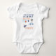 This cute bodysuit is for the rambunctious boy in your life that is fierce! The colours are navy blue, grey, and orange. The images are hot-air balloons, clouds, and an aeroplane. The text reads: "And Though He Be But Little He Is Fierce"!