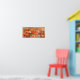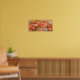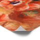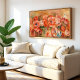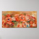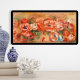 The artwork depicts red, orange and white anemones tumbling across this horizontal composition over a neutral background. Vivid and bright colours dominated by red and orange with some shades of blue and green.