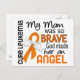 Honour and remember your mum who bravely battled Leukaemia with My mum Was So Brave t-shirts, merchandise, and gifts featuring contrasting text fonts and an eye-catching orange Leukaemia awareness ribbon adorned with fluttering Angel wings.Copyright Notice: Please note that Awareness Gift Boutique holds the Copyright to this design. Any use or reproduction without written permission is strictly prohibited.