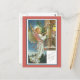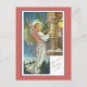 Vintage artwork of a blonde angel carrying a small evergreen tree and knocking at a little girl's window