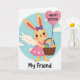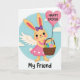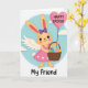 This card shows a friendly bunny character centered on a round, sky-blue backdrop edged with a thin white dotted ring 🐰. The bunny wears a scalloped pink dress with small white heart details, and a violet bow sits neatly between its upright ears. Soft cream wings extend from its back, adding a gentle, caring look as it faces forward with a sweet, welcoming expression. In one paw it holds a woven basket filled with decorated eggs in mixed patterns like stripes, dots, swirls, and simple geometric shapes in pastel shades. In the other paw, it holds the string of a large fuchsia heart-shaped balloon, suggesting a close bond like a hug sent from afar 🐇. The seasonal greeting appears inside the heart balloon in light-colored lettering, while “My Friend” is placed along the bottom in a darker contrasting color. The scene stays airy and soft, with the basket’s curved handle and the balloon’s glossy highlight standing out against the calm blue circle.