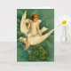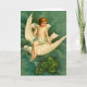 In this vintage image a pretty little red-headed angel in sitting on a beautiful white dove while flying through the air. Both the angel and the dove are holding blue ribbons that are tied to four-leaf clovers that are streaming beneath them.