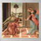 vintage and antique renaissance painting by the florentine artist sandro botticelli of the angel gabriel announcing the news to mary in a beautiful earth coloured interior with patterned floor, and a gorgeous landscape with trees, castle on a hill, bridge, and twining river is seen through a doorway into the garden. italian renascence style painting of 'the annunciation' with the angel gabriel in a beautiful pink cloak, wings, and holding a white lily flower, is gesturing to mary who is wearing red and blue gown and is demure and reluctant in her expression, both are inside a house with a doorway that through which is seen a lovely rural landscape.