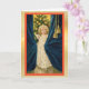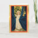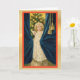 The front of this Holiday greeting card features a vintage image of a little angel girl dressed in white. There are gold stars on her gown, and she wears a star headress. She holds blue velvet drapes open to show a glowing Holiday tree in the background. The image is placed on a light infused gold gradient background, and is bordered in red orange with a thin gold line.. The inside of the card is solid matching blue on the left and the other side is white, and partially left blank for your own message, with custom text fields for your signature at the bottom. Celebrate Christmas the old fashioned way with this beautiful card showcasing an image from days gone by.