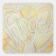 The inspirational word "Angel" rests on soft pastel angel wings. The word is topped by an angel halo hovering above pink and yellow hearts. The background is a subtle rainbow of cross-hatching. A few golden yellow hearts float around the edges. A version of this art comes with a light layer of glitter around the edges to give it an angelic twinkle.