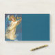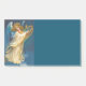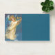 vintage art with painting of an angel with angelic expression, beautiful flowing dress and golden harp in blues and beige.