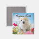 The design depicts a bichon puppy in a meadow looking angelic.