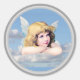 vintage art with painting of pretty girl angel resting on white fluffy clouds in the sky.