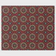 An intricate, kaleidoscope mandala in rich red and royal purple accented in gold tones, in an overlapping, repeat pattern. The shapes in the design are from photographs of the intricate designs of stained glass church windows. The colours come from the robes of depicted angels and saints.