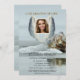 Funeral remembrance invitation featuring a angel wings with photo, and seashell on the beach celebration of life template that is easy to personalise.