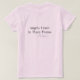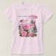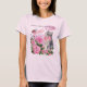 pink T shirt with a cat that is wearing a pink bow. The cat is sitting on pink roses and looking up at a cherub/ angel. The wording above says that angels come in many forms...this is a shirt by keshet