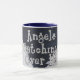Ringer style mug with blue rim and handle with the words "Angels Watching Over Me" with two angels in clouds on either side. Let someone know a higher power is looking over them.