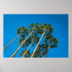 Angle perspective of group of tall thin palm trees on blue sky background. Summer vacation, travel destination concept. Vintage effect