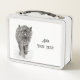 This is a standard metal lunchbox that appears to work just fine. We designed this box ourselves with an uploaded photo and custom text on the front and back. It looks absolutely beautiful except the front of the lunchbox is not centered like it shows in the photo. The print borders don't align with the inset flat part of the box where the preview photo online showed it perfectly centered in there. The back looks nice and centered though.