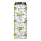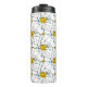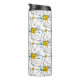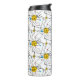 Black linear angles and circles in primary colours of red, yellow and blue make up the contemporary retro pattern embellishing this thermal mug reminiscent of Mid Century Modern design and the Atomic Age of the 1950's and 1960's.