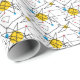 Black linear angles and circles in primary colours of red, yellow and blue make up the contemporary retro pattern decorating this gift wrap, reminiscent of Mid Century Modern design and the Atomic Age of the 1950's and 1960's.