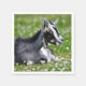 Animal black and white goat (Capra aegagrus hircus) lying on the flowering grass